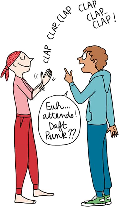 Répète le rythme autant de fois que nécessaire pour que les autres joueurs trouvent le titre. Si le rythme ne leur suffit pas à deviner, donne-leur un mot en lien avec la thématique de la musique mais qui n’est pas présent dans les paroles (ex : le dernier jour du disco de Juliette Armanet > boule à facettes).