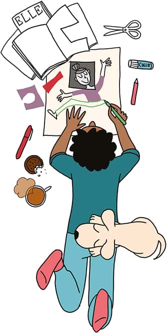 Colle-la au centre de la feuille et poursuis-la en couleur ou au feutre en t'appuyant sur les lignes de l'image, les formes ou les couleurs les plus évidentes.